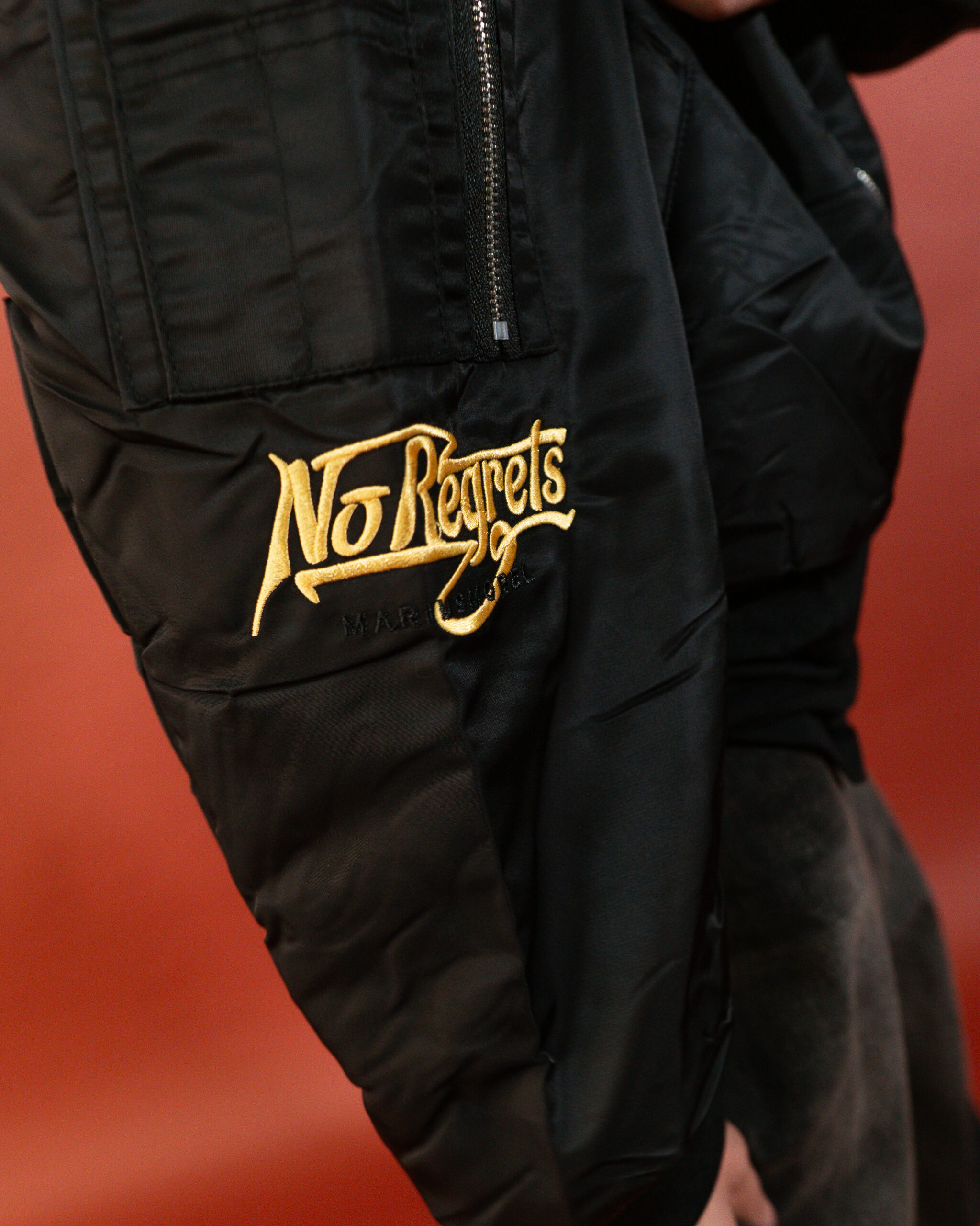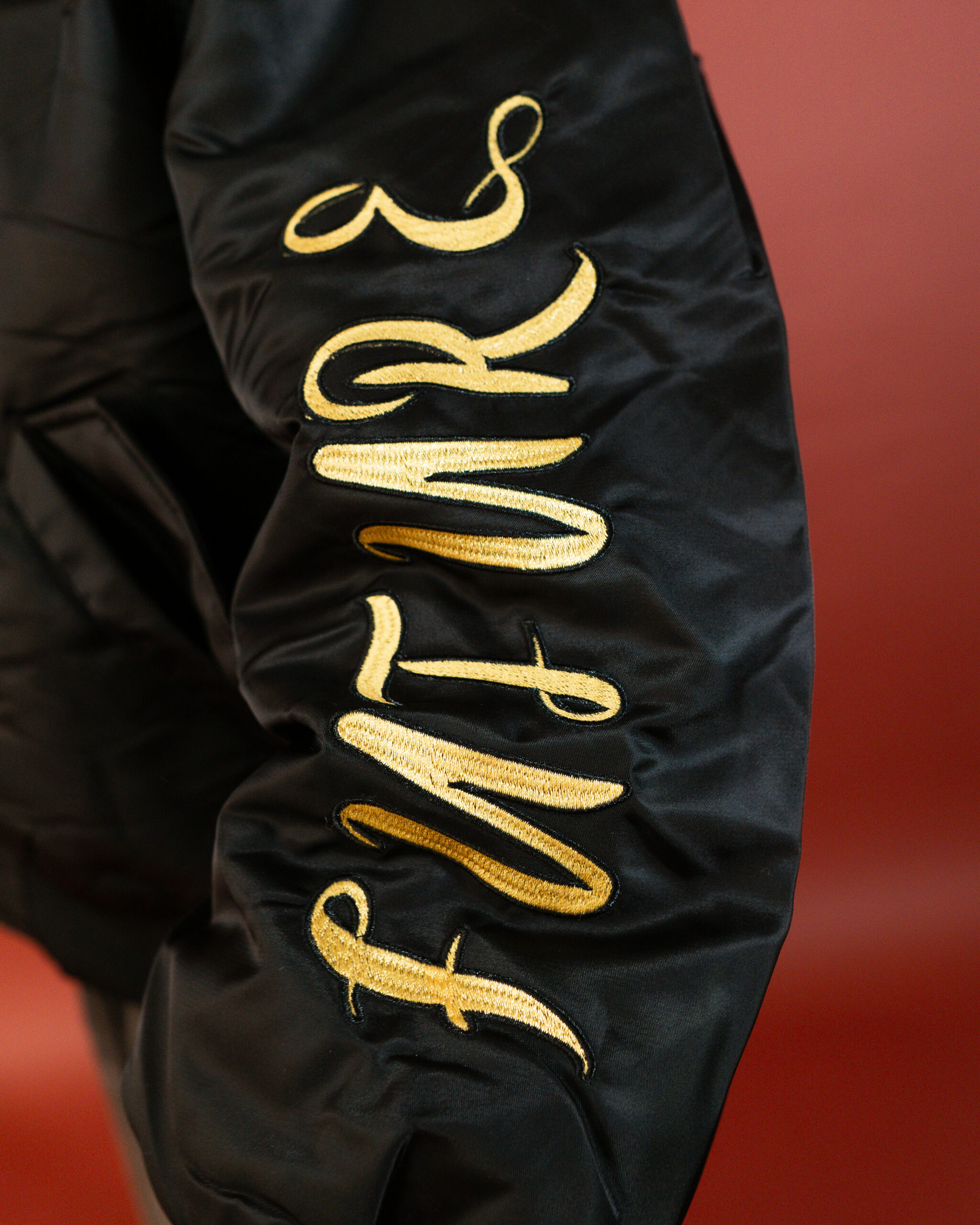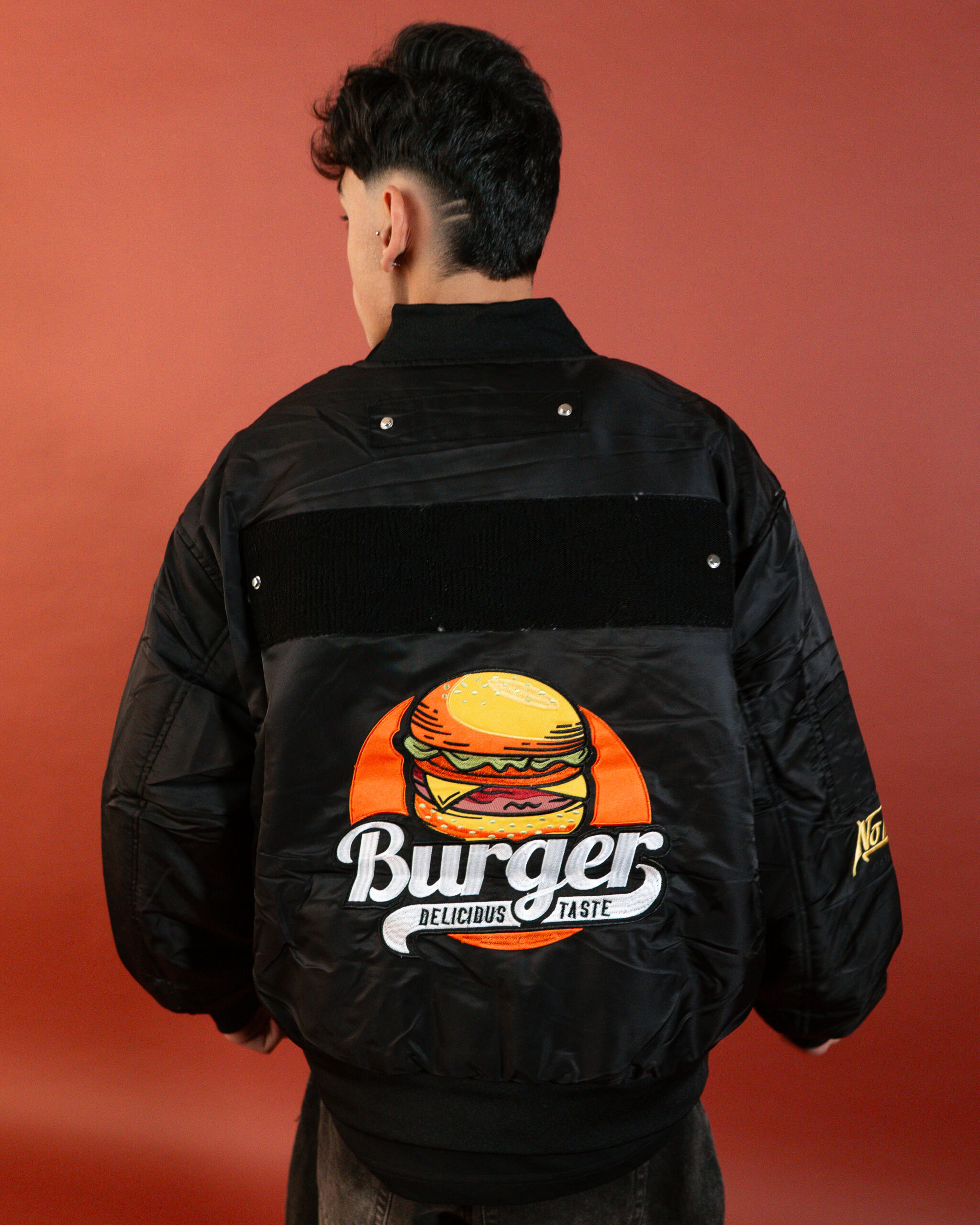 Il College Burger è un bomber jacket MA-1 dall’estetica streetwear ricca di dettagli e ricami statement. Realizzato in nylon tecnico nero lucido con imbottitura leggera, questo flight jacket presenta la silhouette classica del bomber militare reinterpretata con grafiche bold. Il colletto a fascia, i polsini e l’orlo a costine elasticizzate garantiscono vestibilità e protezione dal vento. La chiusura frontale è affidata a una robusta zip centrale, mentre sul petto si trova una tasca orizzontale con bottoni automatici che aggiunge funzionalità e stile utility. I ricami dorati sono i veri protagonisti: sulla manica sinistra campeggia la scritta “No Regrets” in caratteri elaborati e decorativi, sul petto il patch “Authentic World” con dettagli blu, e sulla manica destra altri ricami completano il design ricco di grafiche. Le tasche laterali oblique offrono praticità. La vestibilità oversize e il materiale tecnico lo rendono perfetto per layering urban. Ideale da abbinare a felpe, hoodie o t-shirt oversized per outfit streetwear che celebrano l’estetica bomber con attitude audace.