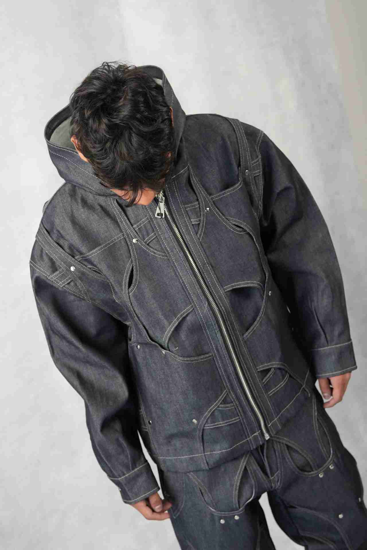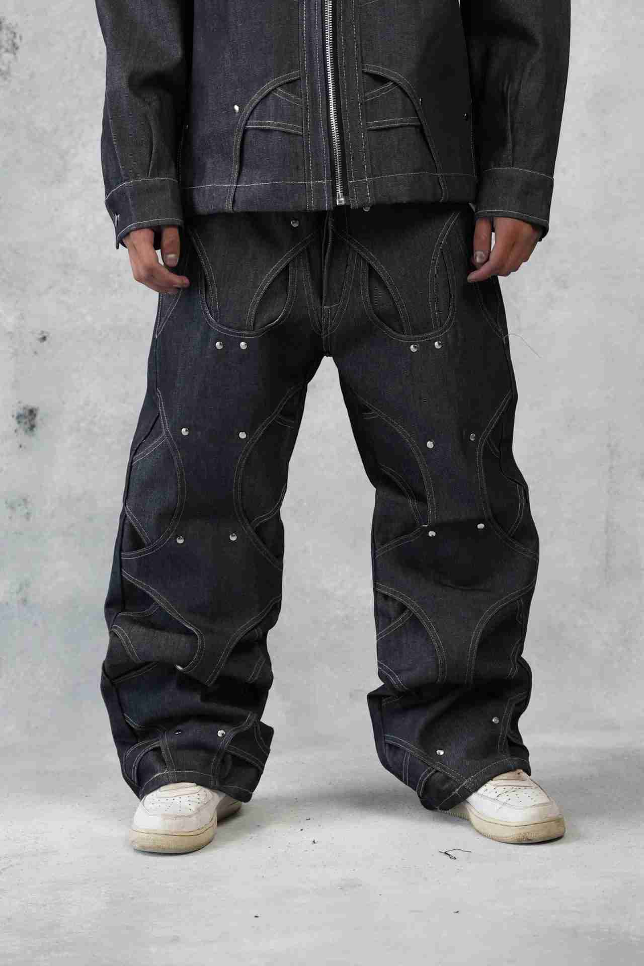 Il Coordinato Blue Passion è un completo dal design urban ricercato che unisce carattere e stile contemporaneo. Realizzato in denim blu scuro, si distingue per le cuciture a contrasto e i dettagli geometrici arricchiti da applicazioni metalliche che donano un tocco unico. La giacca con zip frontale e cappuccio offre praticità e un look deciso, mentre i pantaloni dal fit relaxed completano l’outfit in perfetto stile streetwear. Ideale per chi vuole distinguersi con un look d’impatto.