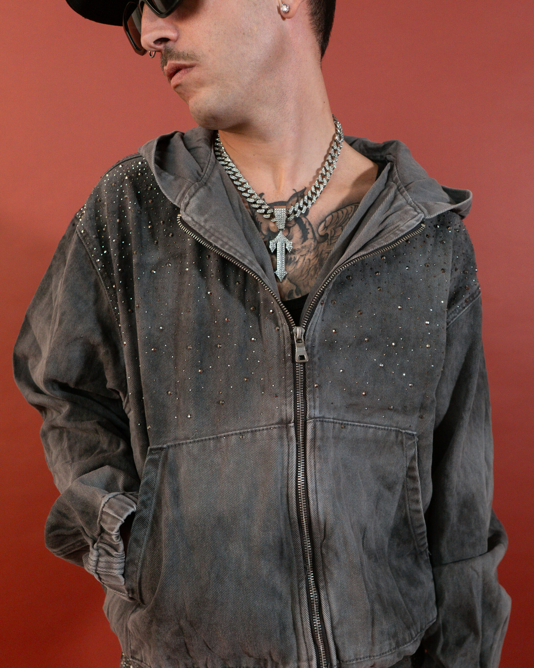 Il Coordinato Brill Grey è un completo streetwear luxury dall’estetica Y2K audace e scintillante. Composto da giacca e pantalone coordinati, questo set è realizzato in denim grigio stone wash con elaborate applicazioni di strass argentati che creano un effetto constellation sparso su tutto il tessuto. La giacca presenta silhouette bomber con cappuccio, zip centrale argentata, polsini e orlo elasticizzati e tasche laterali. Gli strass sono concentrati maggiormente sulla parte superiore delle spalle e del petto, creando un effetto sfumato verso il basso. Il pantalone baggy coordinato riprende lo stesso trattamento con strass distribuiti su tutta la superficie, tasche cargo applicate sulle cosce che aggiungono funzionalità streetwear, e vita elastica con coulisse per comfort ottimale. Il lavaggio grigio vissuto crea la base perfetta per far risaltare le applicazioni brillanti. Questo coordinato elimina ogni dubbio di styling offrendo un look completo e curato. Perfetto per chi cerca streetwear statement che unisce luxury details, estetica bling e comfort urbano in un set coordinato pronto all’uso.