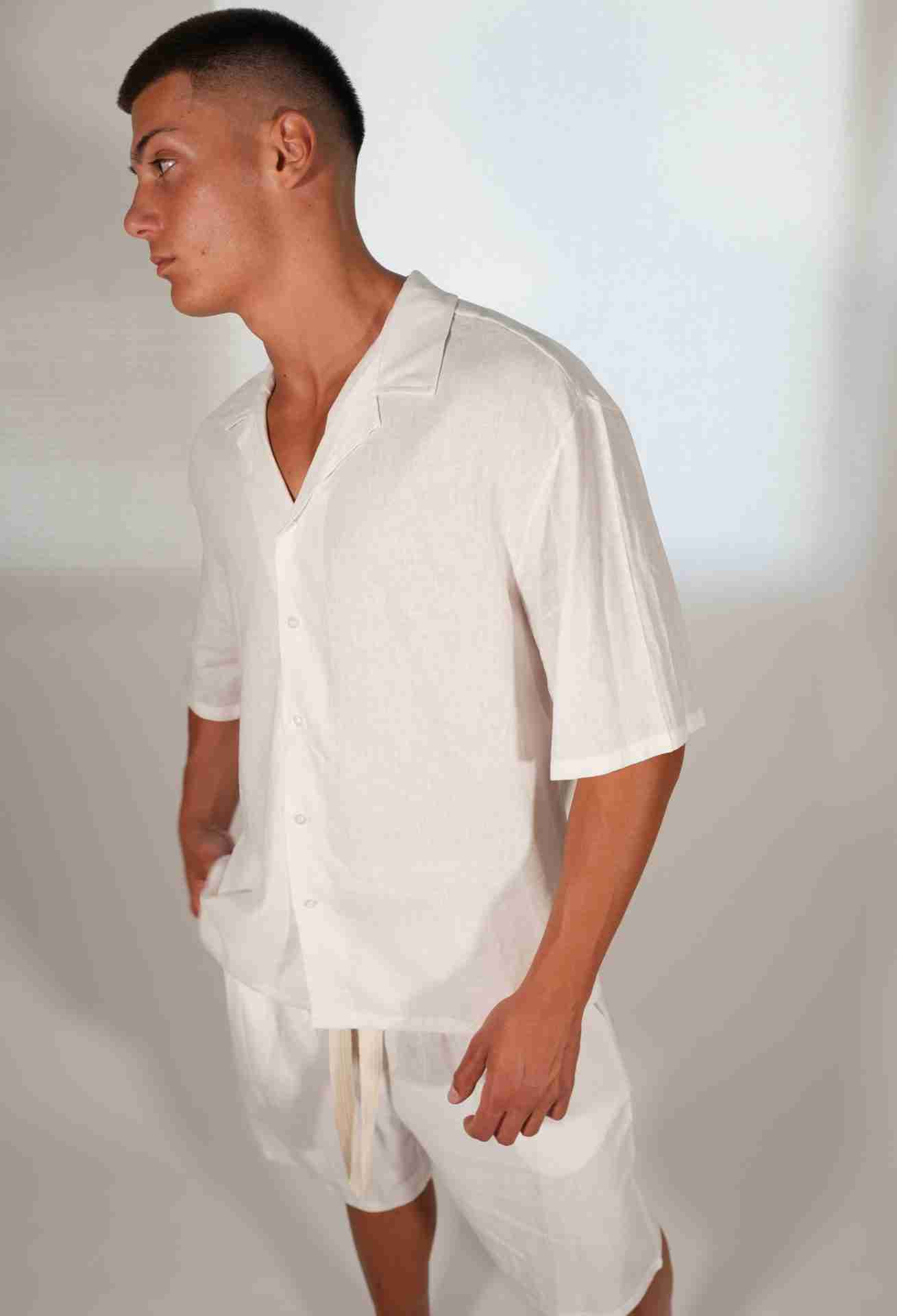 Si compone di una camicia con colletto cubano e maniche corte abbinata a bermuda comodi con coulisse in vita.