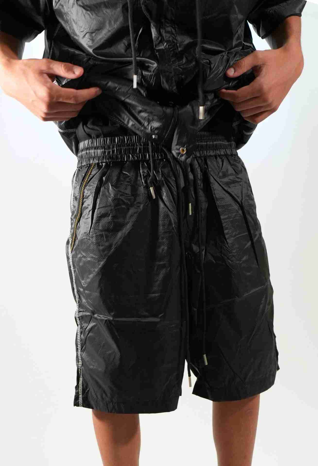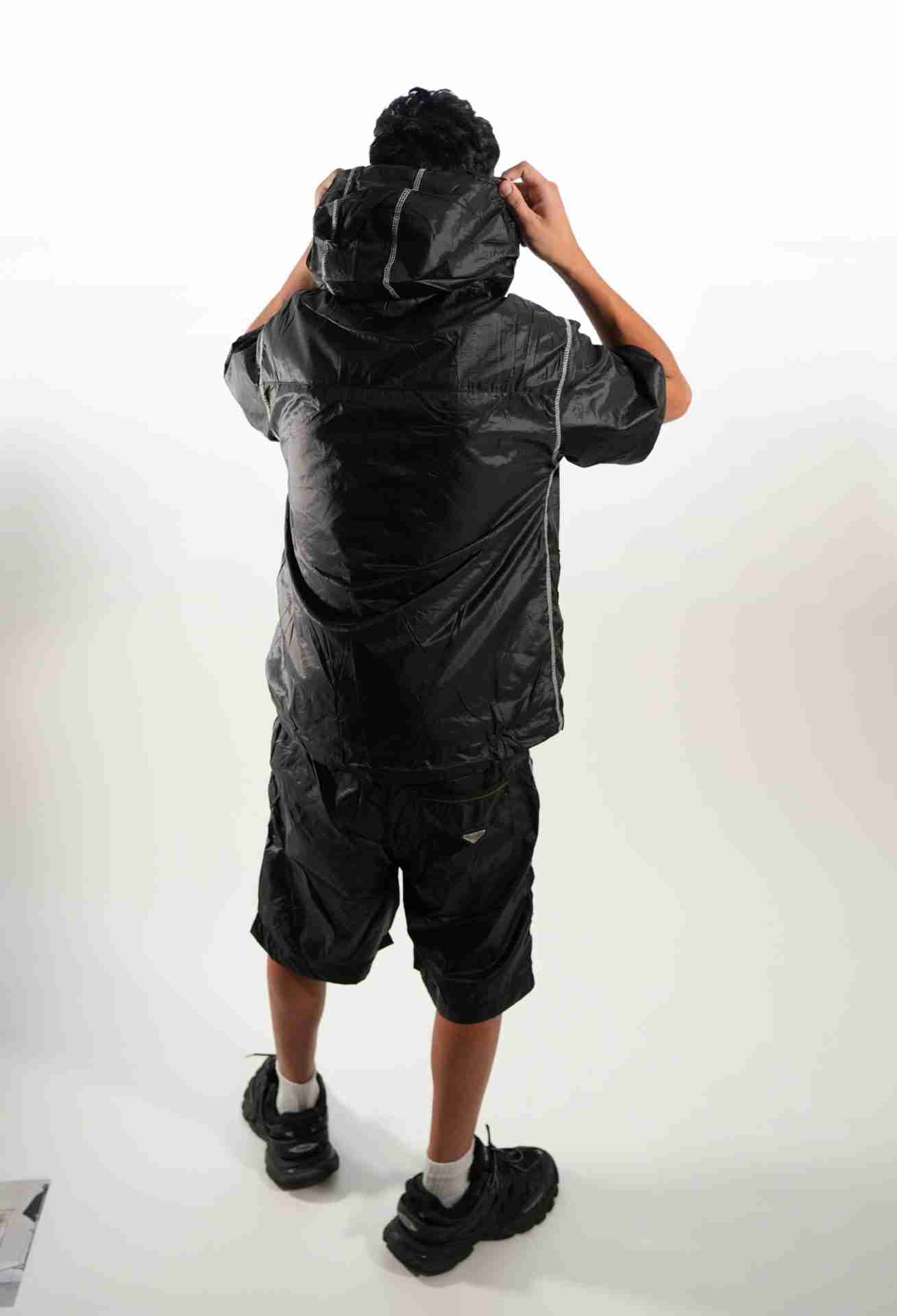 Scopri il coordinato mod pr**a, un completo dallo stile futuristico e urban, ispirato alle passerelle ma pensato per la vita di tutti i giorni. Realizzato in tessuto tecnico nero effetto lucido, questo set composto da giacca con cappuccio e pantaloncino corto unisce estetica sportiva e dettagli funzionali.