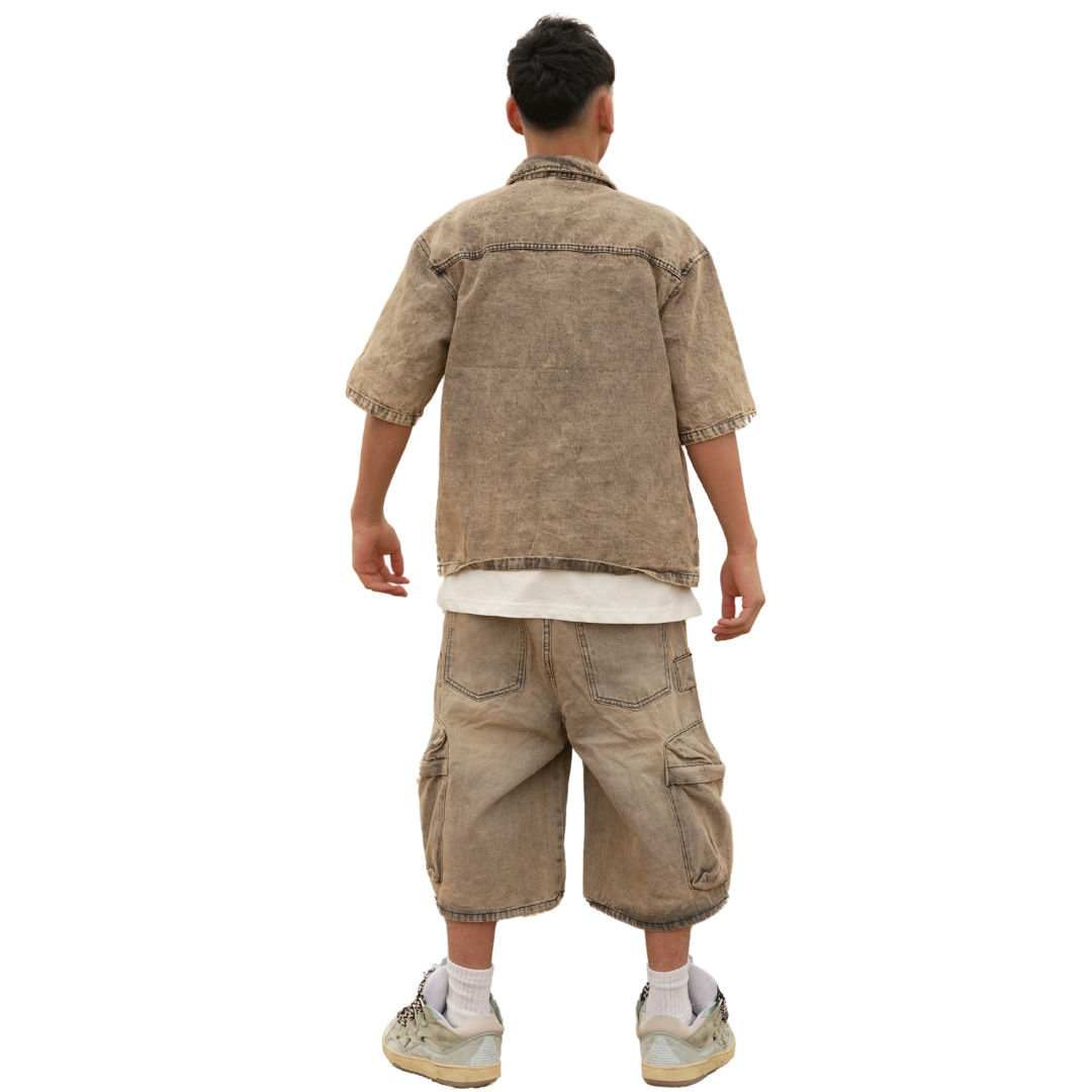 Coordinato color safari composto da camicia con colletto classico e pantaloni cargo con tasche applicate. Vestibilità rilassata e tessuto leggero per un look urbano e pratico. Ideale per outfit streetwear estivi, da completare con sneakers chunky e accessori bold.