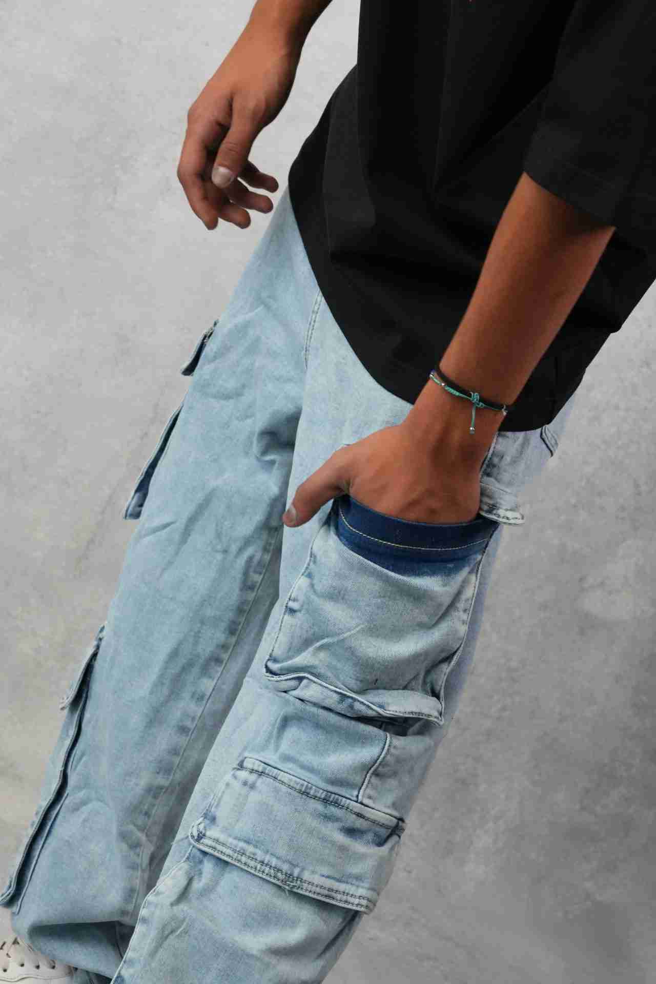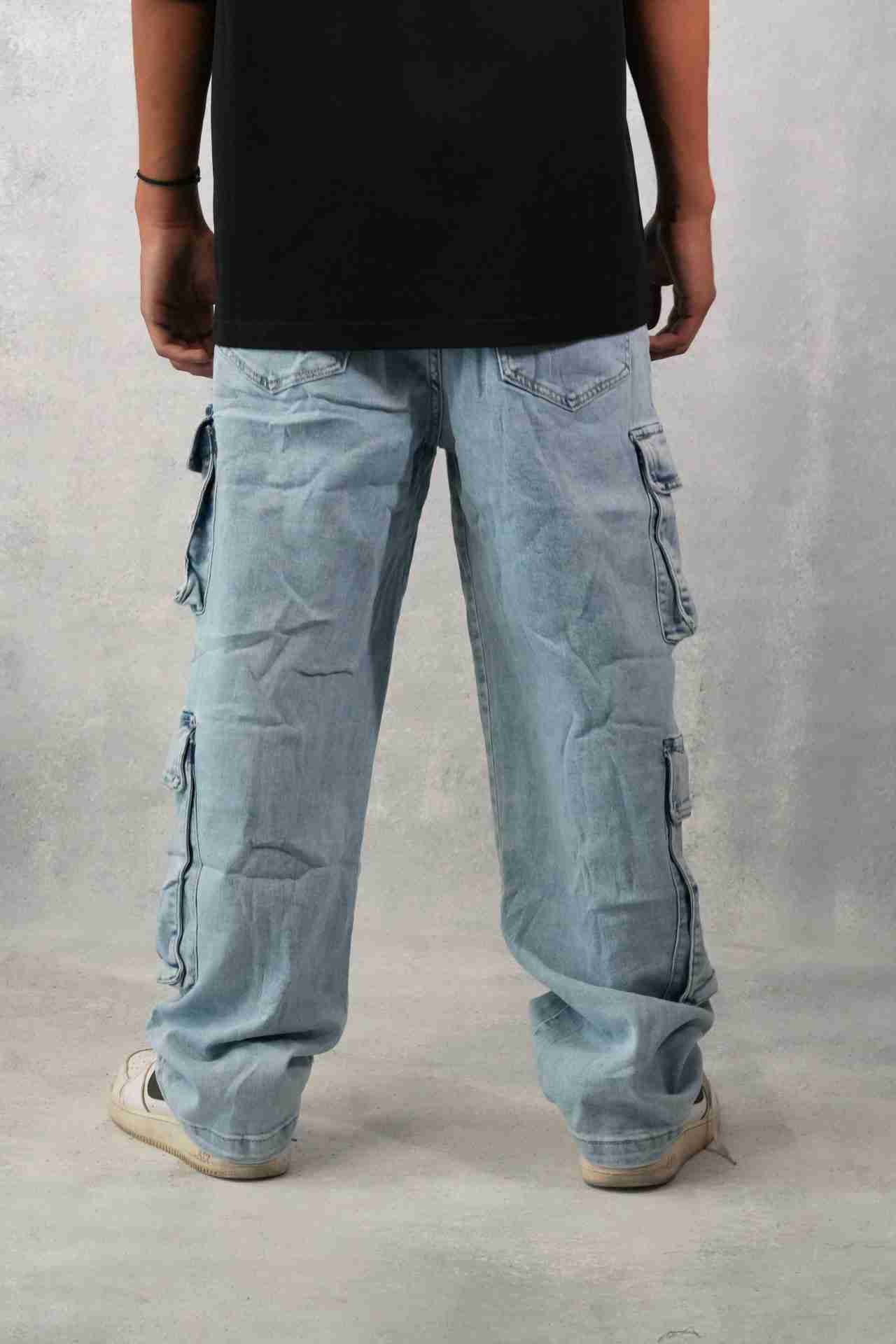 Jeans Cargo in denim azzurro chiaro con vestibilità relaxed e dettagli streetwear. Caratterizzati da tasconi laterali multipli con patta, uniscono funzionalità e stile urbano, perfetti per chi cerca praticità senza rinunciare al design. La struttura resistente e il lavaggio chiaro li rendono ideali per completare look casual o street, da abbinare a t-shirt oversize o felpe.