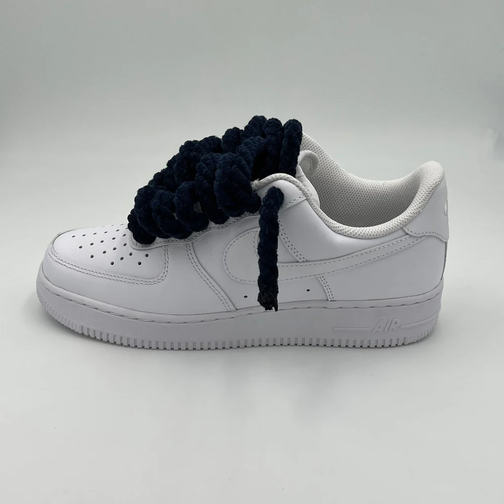 Immergiti nello stile distintivo delle nostre Nike Air Force 1 personalizzate, caratterizzate da un tocco unico: lacci spessi in colorazione Obsidian con estremità in plastica per evitare sfilacciamenti indesiderati.