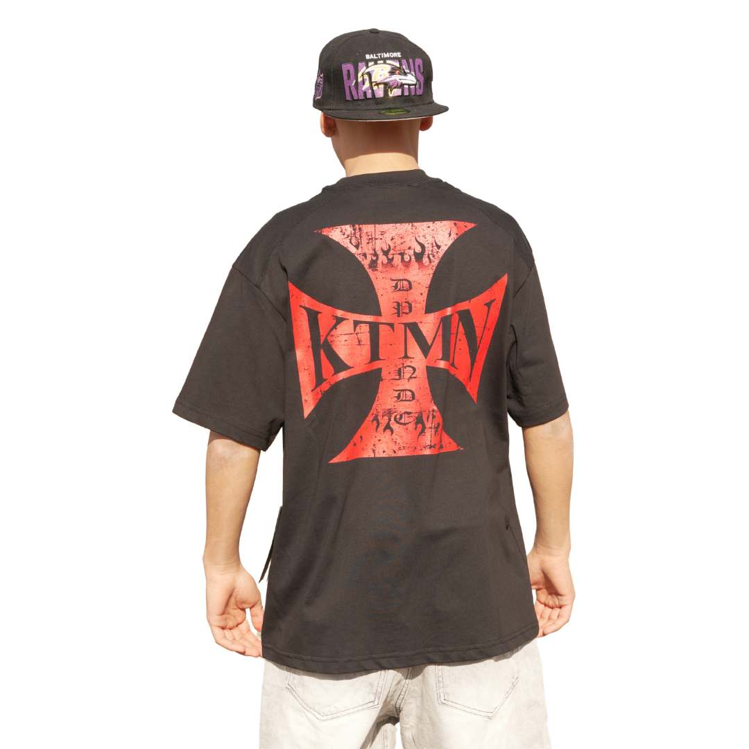 T-shirt unisex in cotone nero, caratterizzata da una stampa grafica KTMN sul petto. Vestibilità regular e dettagli minimal per un look urbano essenziale. Perfetta da abbinare a jeans cargo o pantaloni oversize per uno stile street contemporaneo.