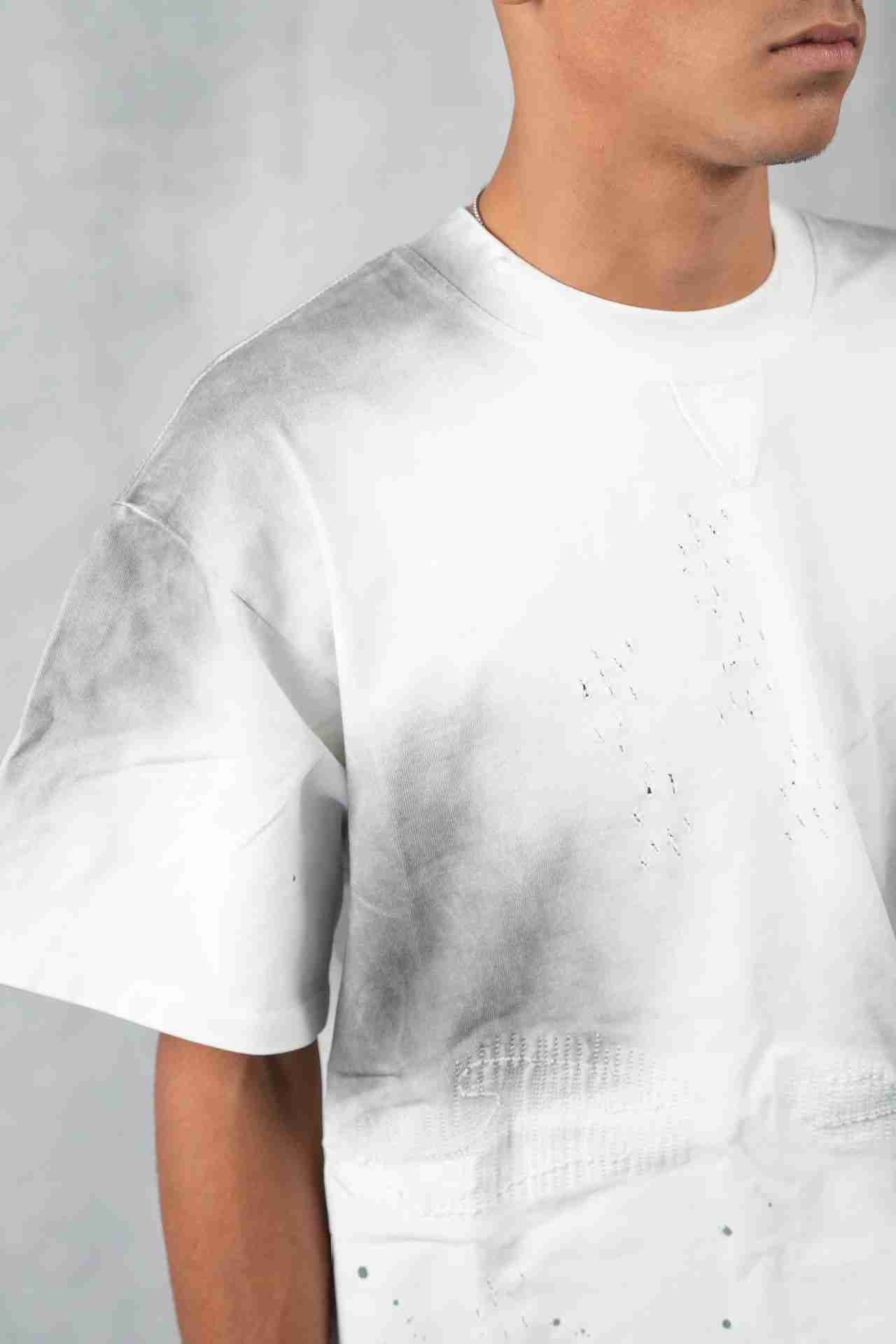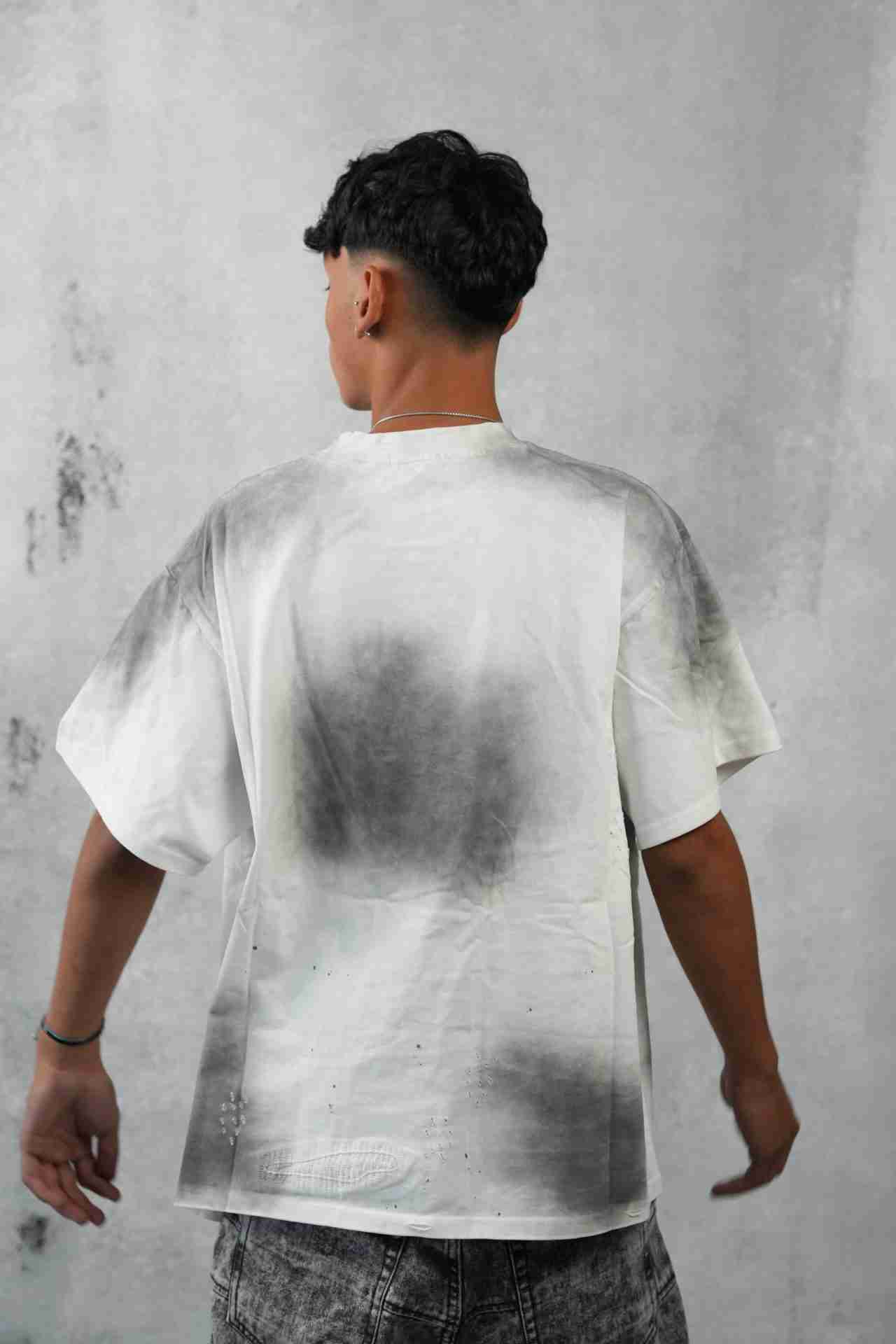 La T-shirt Sporcata White è un capo dallo stile streetwear unico e di carattere. Realizzata in cotone bianco con effetto “sporcato” in sfumature di grigio e nero, presenta dettagli distress e micro-rotture che donano un look vissuto e autentico. Vestibilità over per un comfort moderno, perfetta da abbinare con jeans cargo o denim lavati per outfit urban e contemporanei.